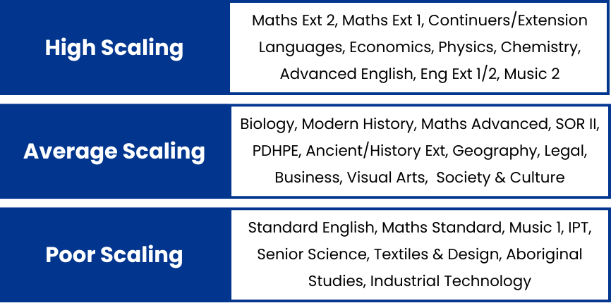 While scaling should not be the only factor in choosing your subjects, it’s helpful to understand how different courses tend to scale. High scaling subjects will generally push your marks up, but you need to be achieving at least 70/75 for scaling to be of benefit.