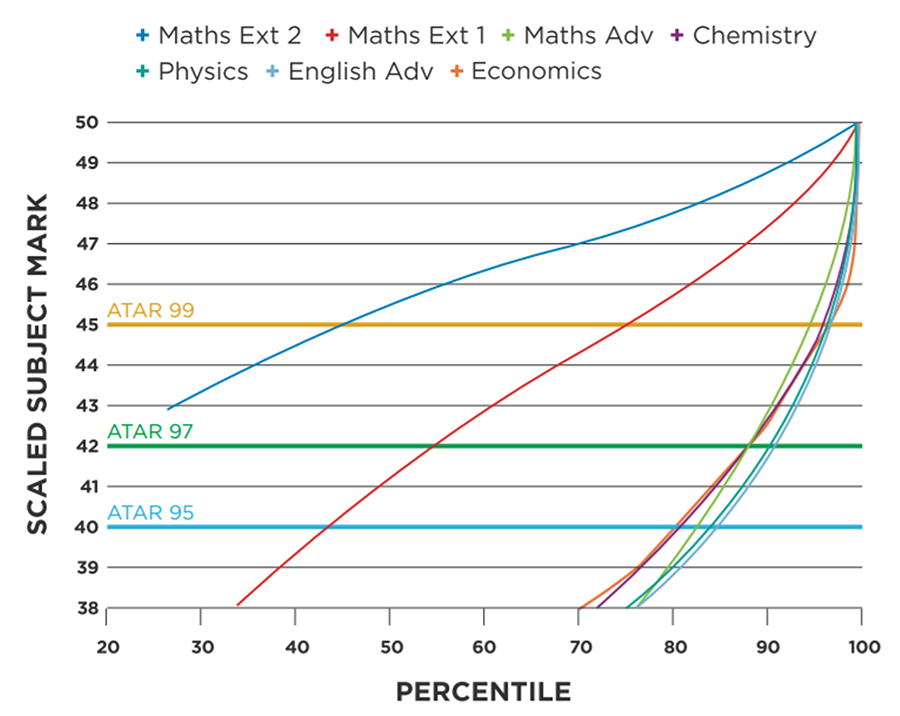 Subjects where most students also perform well in other subjects (e.g., Physics or Maths Extension 2) often scale higher.