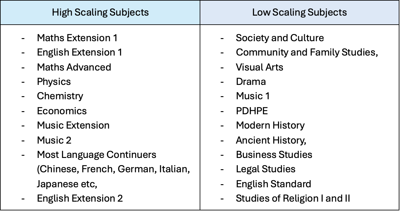 High Scaling subjects typically are hard to score highly in, have strong cohorts and therefore get scaled up to compensate. For example, as shown earlier in this article, an 80 in Maths Extension 2 can scale into the low-to-mid 90s, whereas an 80 in many other subjects would not.